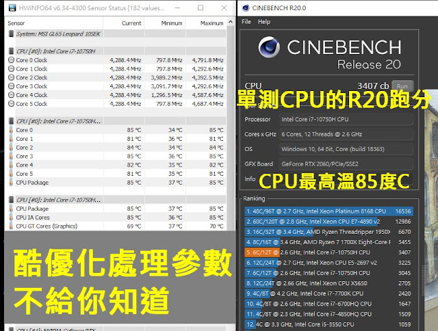 筆電裝雙通道DRAM的好處,用圖片說明讓你知道了解微星GL65_10SEK,非串燒散熱設計,單測CPU的跑分