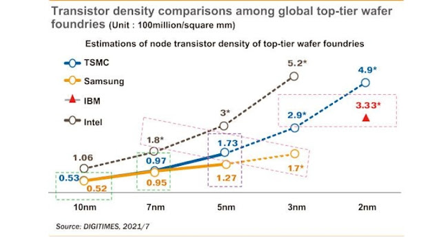 不過intel的7奈米的電晶體密度就目前看到的技術規格會比台積電的5奈米更高蘋果的m1晶片是目前台積電5奈米製程的代表